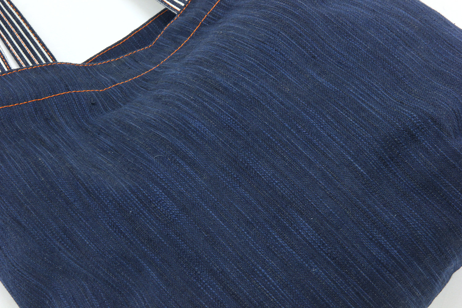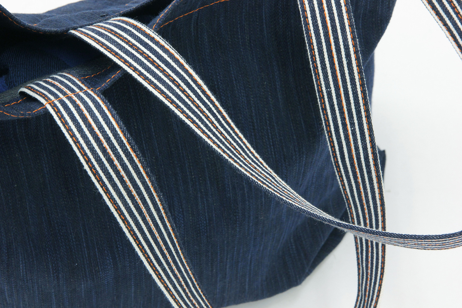 藍染で染め上げた糸から織ったデニムで作ったかわいいバッグ。カジュアルなデザインでありながら、しっかりとした生地と縫製、藍染の風合いが手づくりでしか味わえない上質感を醸し出します。大きめサイズなのでエコバッグとしても使えます。紐の部分はヒッコリーです。