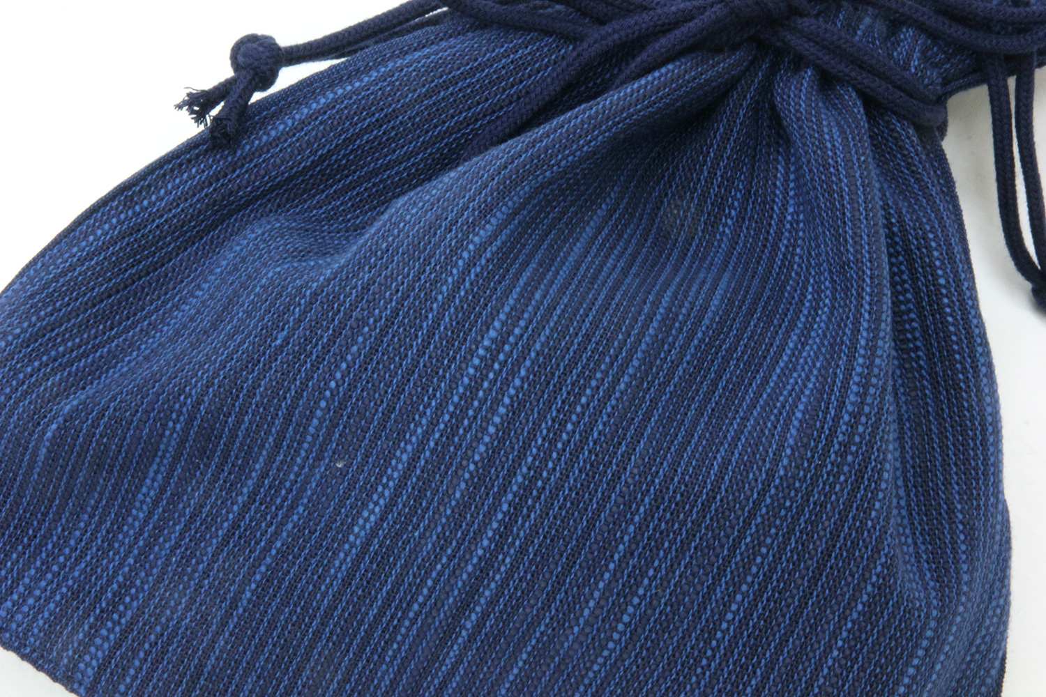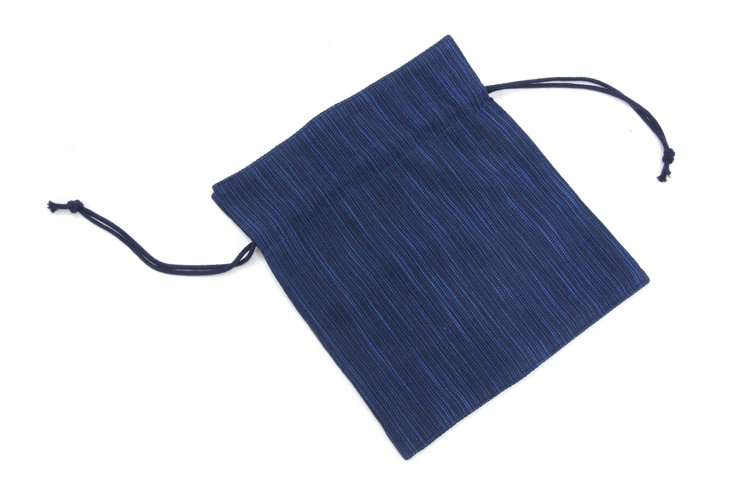 藍染生地で作った巾着。画像は藍染糸で織った紬(つむぎ)と抜染柄のもの。和装時の小物入れとしてお手元のおしゃれに最適です。