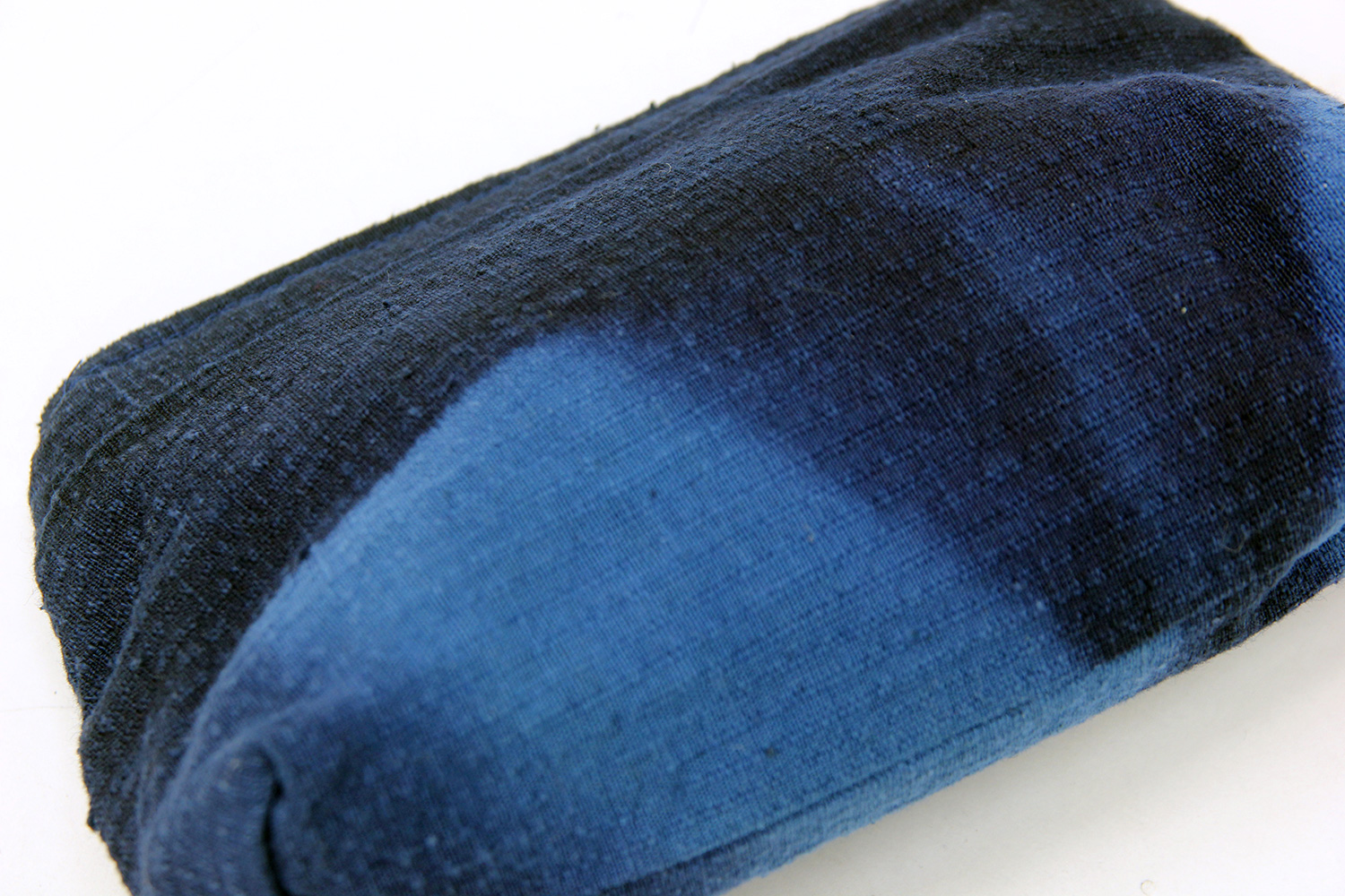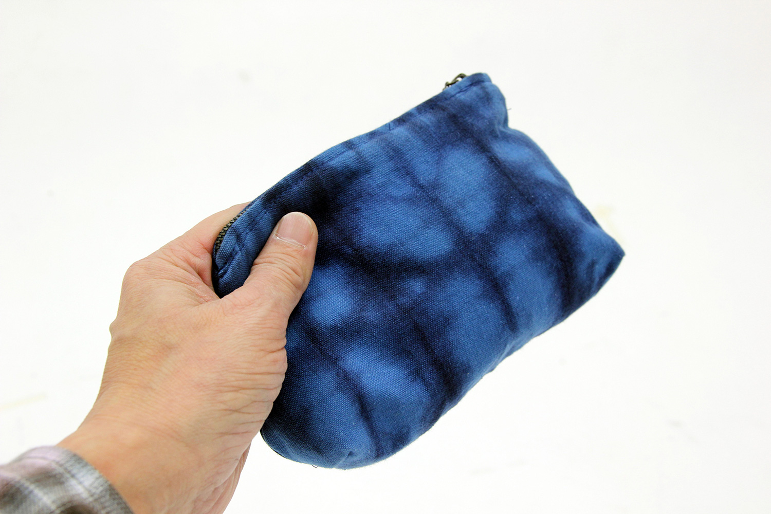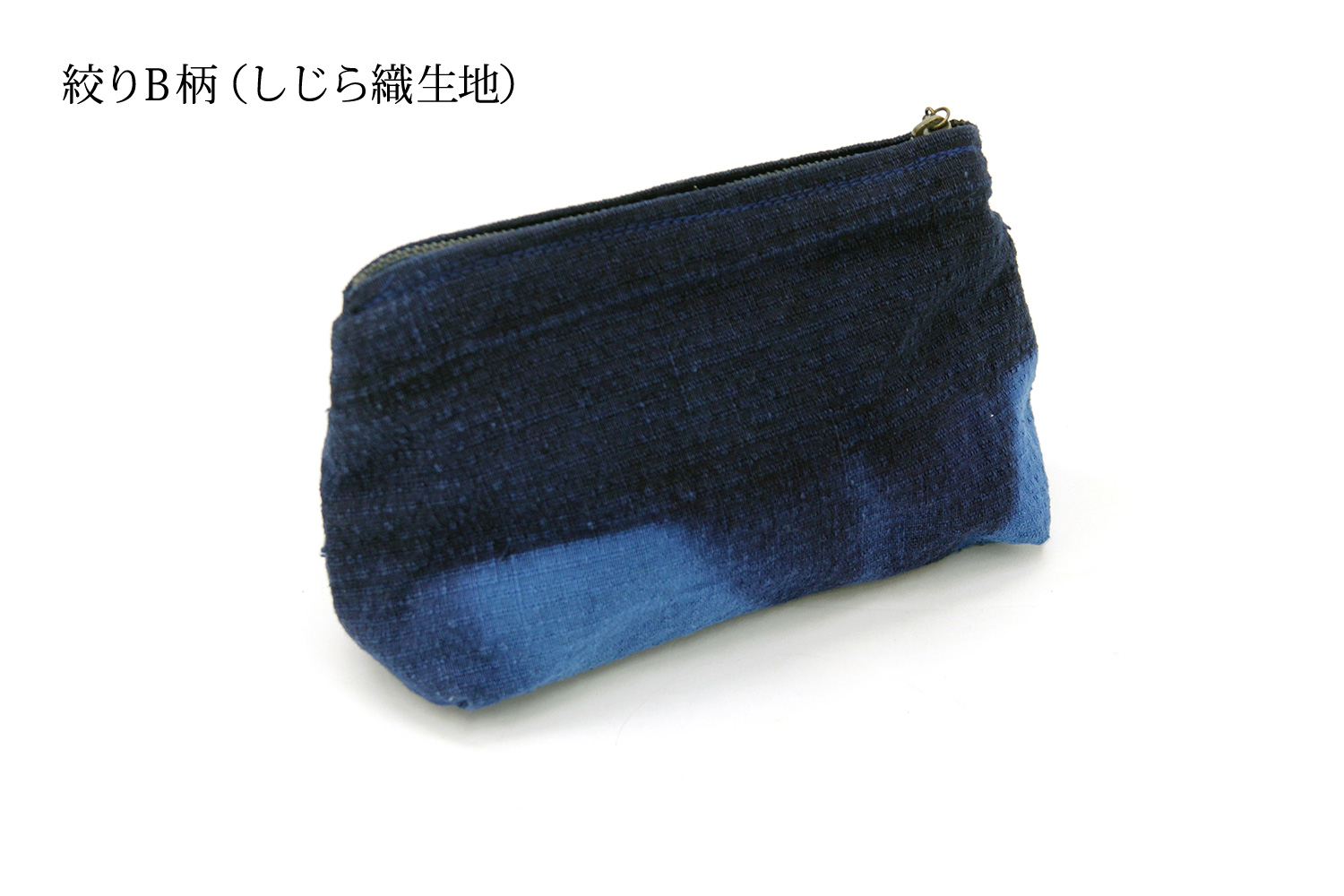 伝統の染め技法、絞り染めで藍染したポーチです。絞り染めは染めるたびに違った柄が出来上がるので、他にはないご自身だけのポーチとなります。
