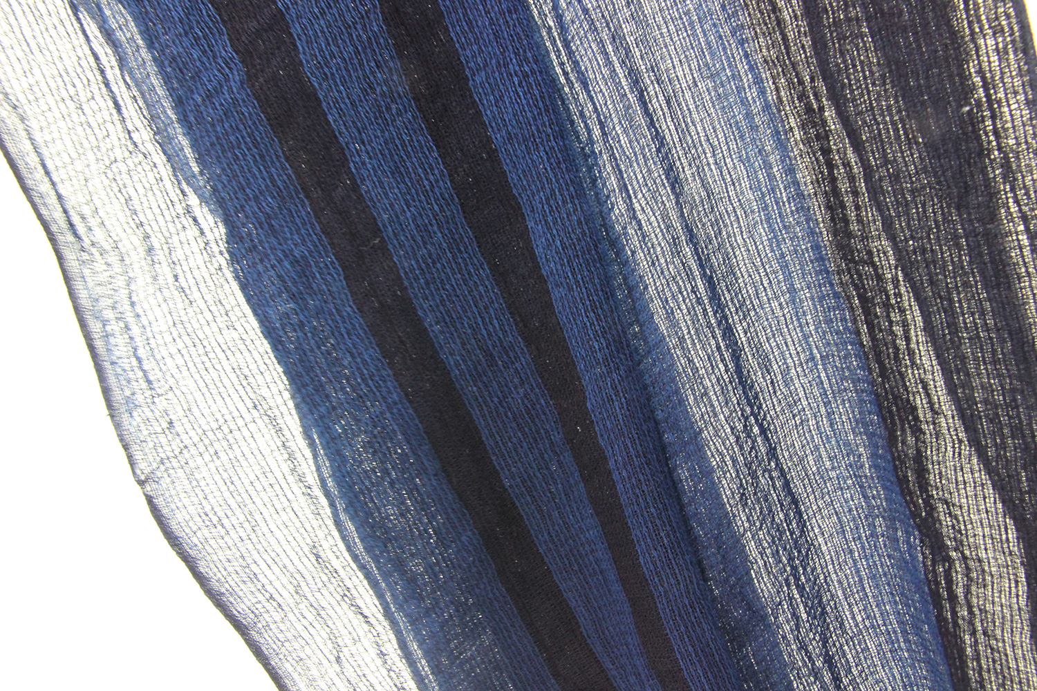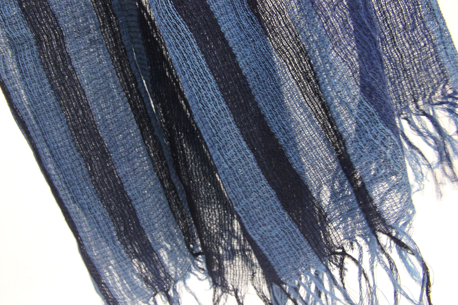 江戸の中期に織られた和田縞紬を再現した、セルヴィッチ生地(旧式織機を使って織られた生地)の薄手で柔らかな藍染のストール。手染めされた藍染の繊維をモダンなストライプに織り上げています。和洋どんなファッションにも合せられるストールです。