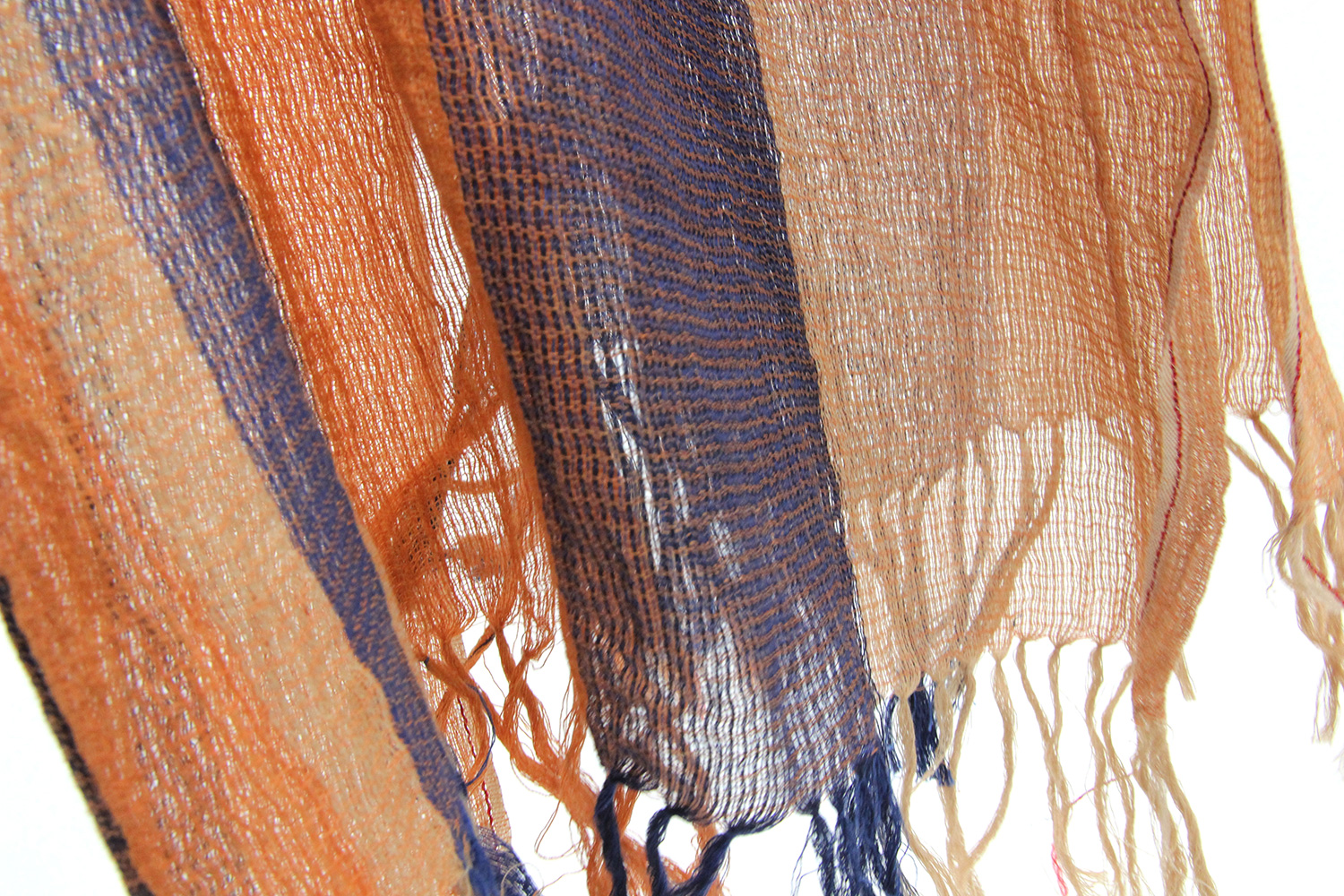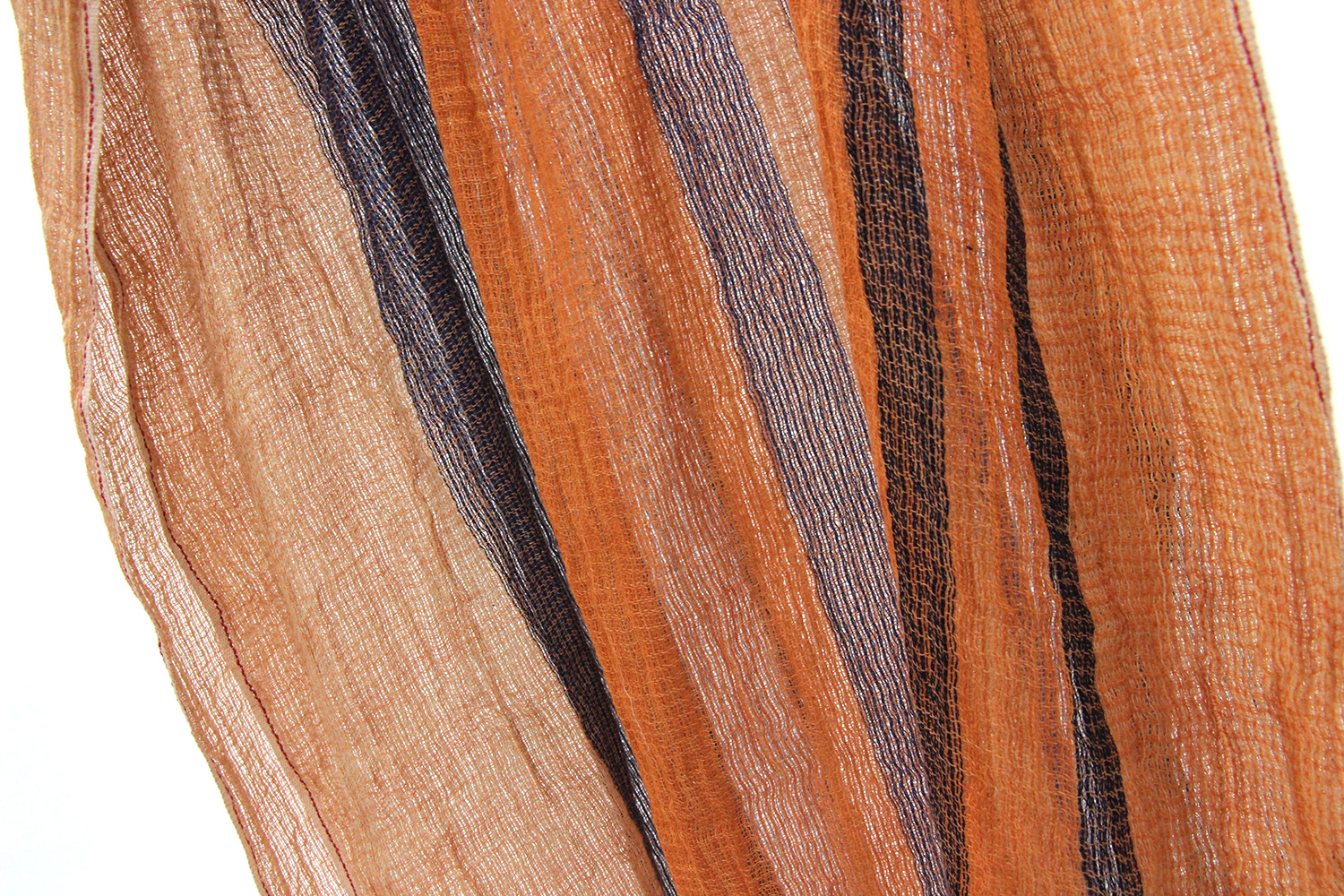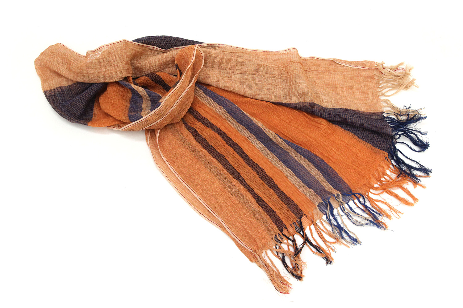 江戸の中期に織られた和田縞紬を再現した、セルヴィッチ生地(旧式織機を使って織られた生地)の薄手で柔らかな藍+柿渋染のストール。手染めされた藍染と柿渋染の繊維をモダンなストライプに織り上げています。和洋どんなファッションにも合せられるストールです。